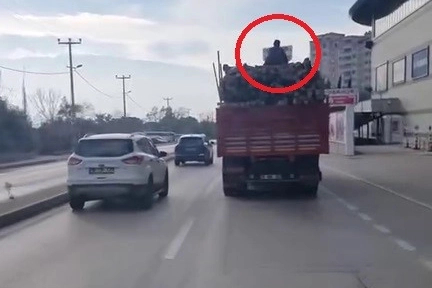 Bursa'da 2 genç, kereste yüklü kamyonun üzerinde seyredip tehlikeli yolculuk yaptı.