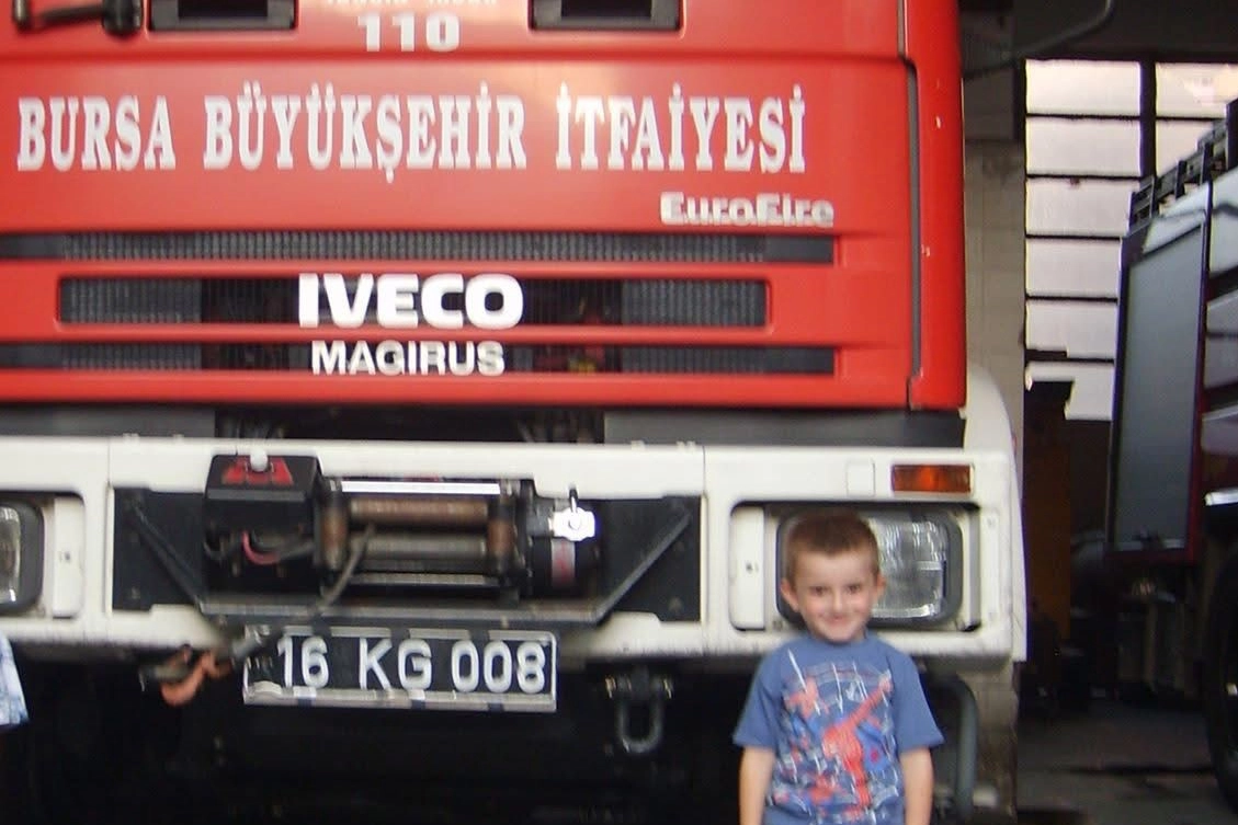 Bursa Büyükşehir İtfaiyesi'nde çalışan Ahmet Burak Öztürk (22), 4 yaşında bir itfaiye kamyonu önünde çektiği fotoğrafı buldu.
