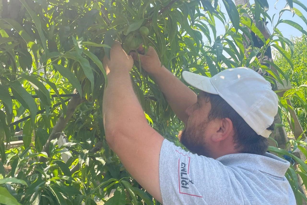 Türkiye'nin şeftali ve armut üretiminde önde gelen Bursa'nın Gürsü ilçesindeki bahçelerde seyreltme çalışmaları sürerken işçiler molaları hariç 8 saatlik çalışmaya 1200 lira yevmiye alıyor.