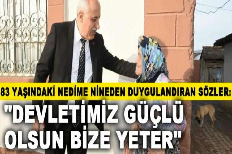 Vatandaşlar ile bir araya gelerek onlarla sohbet eden Belediye Başkanı Davut Aydın, ilçeye bağlı Eğerce Mahallesi'nde yapılan çalışmaları yerinde incelerken; 83 yaşındaki Nedime Özbay yanına giderek elini öptü. Başkan Aydın'ın "Bir emrin var mı anacım diye" sorduğu soruya "Ne isteyeyim oğlum, devletimiz iyi ve güçlü olsun bize yeter. Bak köyün sokaklarını yollarını yapıyorsunuz imkan varsa hepsi oluyor. Halimizi hatırımızı sordun, bizi mutlu ettin. Rabbim yardımcınız olsun. Biz seni ve devletimizi seviyoruz. Bizlerin hatırını sorun ara sıra çaya gelin bize yeter. Dua ediyorum sizlere her şeyin başı sağlık" karşılığını veren Nedime nine duygulandırdı. Yenişehir Belediye Başkanı Davut Aydın da, “Halkımızın duasını almak onların istek ve beklentilerine çözüm bulabilmekten daha değerli bir şey var mı bu dünyada? Nedime annemizin samimiyeti devlet aşkı bizlere moral olurken, sevindirdi. İşte vatan sevgisi işte devlet sevgisi çok duygulandım. Rabbim kendisine sağlık huzur versin. İşte gönül belediyeciliği budur. Bu dualar olduğu sürece ülkemizin önünde hiç kimse duramaz" dedi.