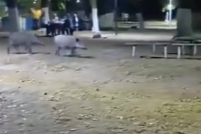 Bursa'nın Karacabey ilçesinde aç kalan domuzlar, insanların oturduğu park alanına indi. O anlar vatandaşlarca kaydedildi.