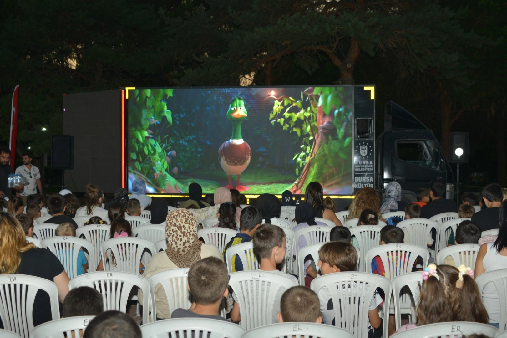 Açık havada çizgi film keyfi Merinos Park’ındaki etkinlik öncesinde dağıtılan patlamış mısır ve içecekleri afiyetle tüketen çocuklar, ‘Ördeklerin Göçü’ adlı çizgi filmi büyük bir keyifle izledi. Özel bireylerin de katıldığı etkinlikte, 7’en 70’e herkes eğlenceli bir akşam geçirdi. Açık havada çizgi film izleyerek çok mutlu olduklarını dile getiren çocuklar, Başkan Mustafa Bozbey’e ve Büyükşehir Belediyesi’ne teşekkür etti.