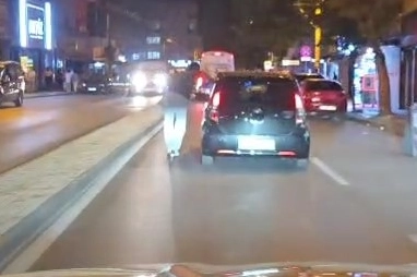 Bursa’da scooter kullanan bir genç trafikte seyir halinde olan başka bir otomobile tutunarak seyretti. O anlar kameralara yansıdı. Bursa’da Yıldırım ilçesi Yeşilyayla Mahallesi’nde Teyyareci Mahmet Ali Caddesi’nde scooter kullanan bir genç, trafikte seyir halinde olan bir otomobile tutunarak ilerledi. O anlar başka bir araç sürücüsü tarafından kameralara yansıdı.