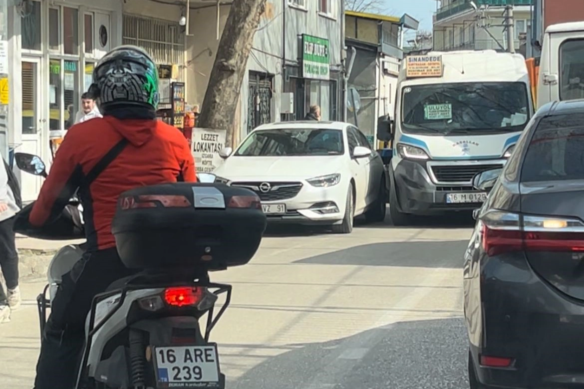 Araç sahibinin uzun süre gelmemesi nedeniyle sürücüler sitem etti. Bursa’nın Yıldırım ilçesi Kurtbasan Caddesi üzerinde bir sürücü iki şeritli yolda kimseyi umursamayıp, otomobili yola bıraktı.