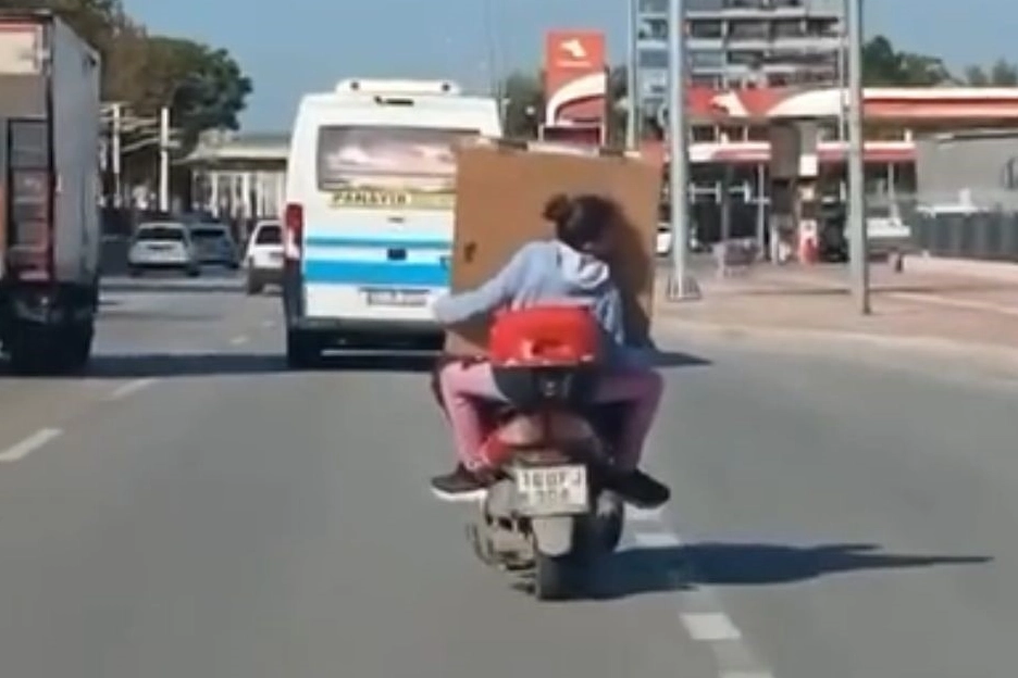 Bursa’nın Yıldırım ilçesinde anayola çıkan bir motosiklet sürücüsü arkasına aldığı kız çocuğuna eşya taşıttı.