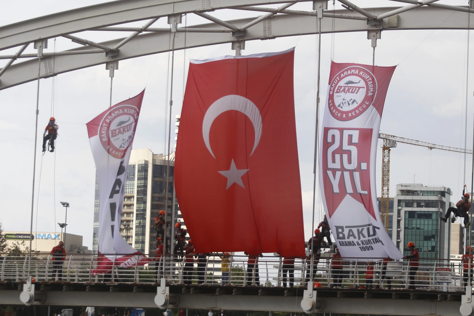 Arama-kurtarma çalışmalarıyla deprem, sel ve doğal afetlerde birçok kişinin hayatını kurtaran sivil toplum kuruluşlarından Bursa Arama Kurtarma Derneği (BAKUT), kuruluşunun 25. yılını Hüdavendigar Kent Parkı'nda kutladı. İstiklal Marşı'nın başlamasıyla halat yardımıyla Hüdavendigar Kent Parkı'nın köprüsü üstüne çıkan ekipler, dev Türk bayrağını açtı.