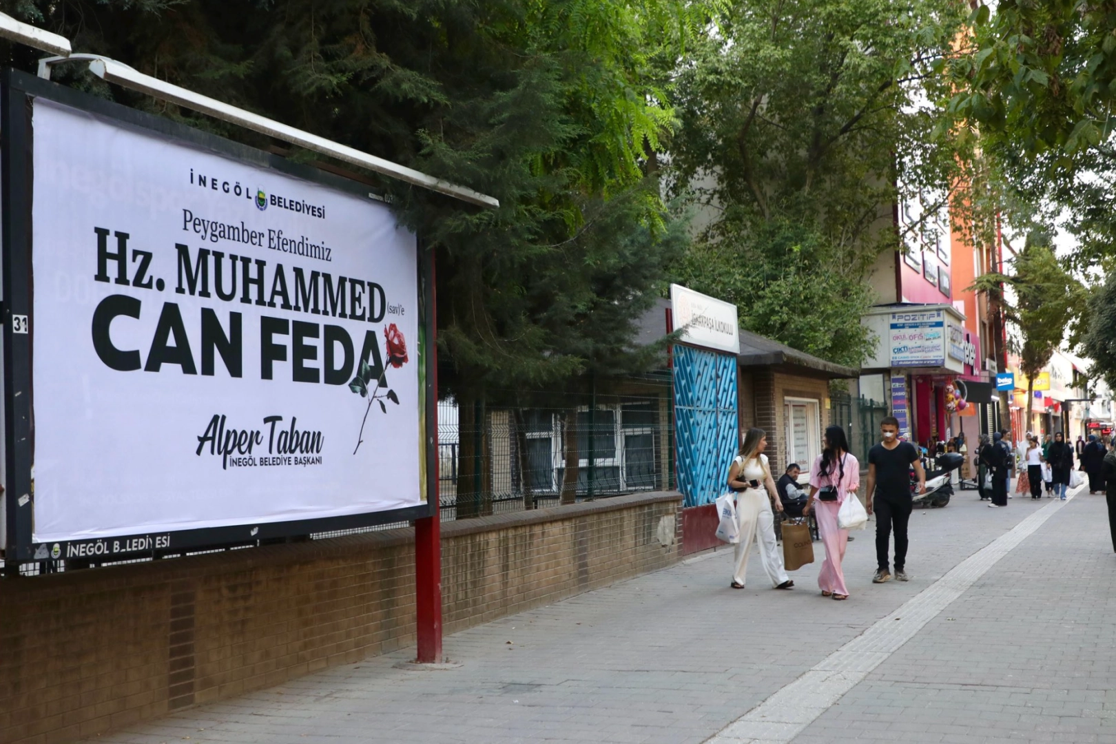 İnegöl Belediye Başkanı Alper Taban’ın talimatıyla ilçenin farklı noktalarındaki açık hava reklam panolarına “Peygamber Efendimiz Hz. Muhammed (s.a.v.)’e can feda” ifadeleri yerleştirildi.