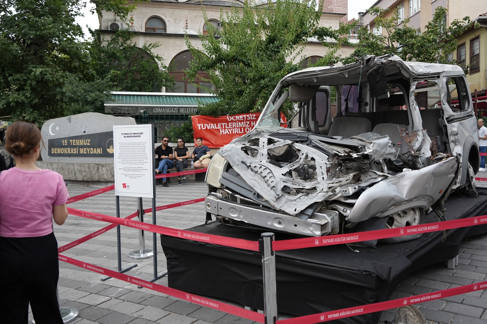 Bursa'da 15 Temmuz'da tankın ezdiği ticari araç, 15 Temmuz Demokrasi Meydanı'nda sergileniyor.