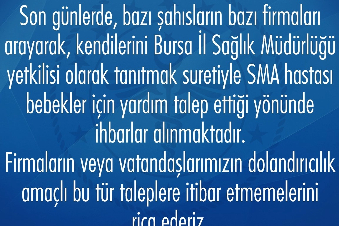 Bursa İl Sağlık Müdürlüğü'nün sosyal medya hesabından yaptığı açıklamada şu ifadelere yer verildi: "Son günlerde, bazı şahısların bazı firmaları arayarak, kendilerini Bursa İl Sağlık Müdürlüğü yetkilisi olarak tanıtmak suretiyle SMA hastası bebekler için yardım talep ettiği yönünde ihbarlar alınmaktadır. Firmaların veya vatandaşlarımızın dolandırıcılık amaçlı bu tür taleplere itibar etmemelerini rica ederiz".