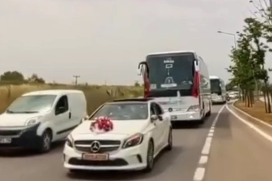Bursa'da düğün konvoyunda yer alan süslenmiş bir otobüs dikkat çekti. Düğün aracı gibi süslenen otobüsle yapılan şehir turu ilginç anlara sahne olurken, konvoydaki bazı otomobil sürücülerinin trafiği tehlikeye düşüren hareketleri tepkilere neden oldu. Araçların aniden fren yapması, zikzaklar çizerek ilerlemesi ve yolda diğer sürücülerin önünü kesmeleri kısa süreli paniğe yol açtı. O anlar kameraya yansıdı.
