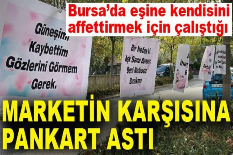 Edinilen bilgiye göre, eşiyle arasında problemleri bulunan bir kişi ilginç bir yöntemle özür diledi. Nilüfer ilçesi Esentepe Mahallesi’nde karısının çalıştığı marketin karşısına aşk yazılarının bulunduğu pankart astı. Orada geçen vatandaşlar asılan pankartlardaki yazıları büyük bir şaşkınlıkla okudu. Bazı vatandaşlar "bence affetmeli" derken, bazıları da "konu bu kadar büyüdüyse büyük bir şey yapmıştır" dedi.