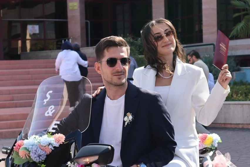 Gelinlik yerine beyaz takım tercih eden Şule Albayrak Çağın ve damat Emre Çağın, süslenmiş motosikletleriyle şehir turuna çıktı. Renkli görüntülere sahne olan anlarda çevredeki vatandaşlar çifti alkışlayarak mutluluklarına ortak oldu. O anları görenler de çiçeği burnunda çifti görüntülemeyi ihmal etmedi.