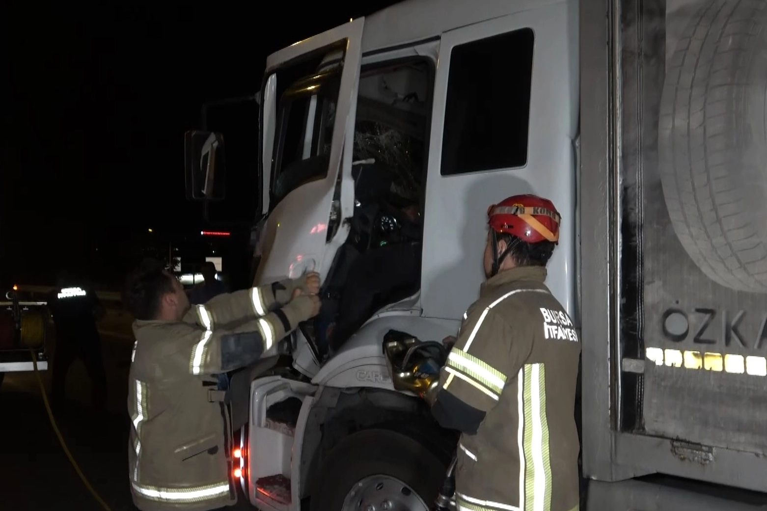 Bursa'da seyir halindeyken kereste yüklü tıra arkadan çarpan kamyonetin sürücüsü şoför koltuğunda sıkıştı.