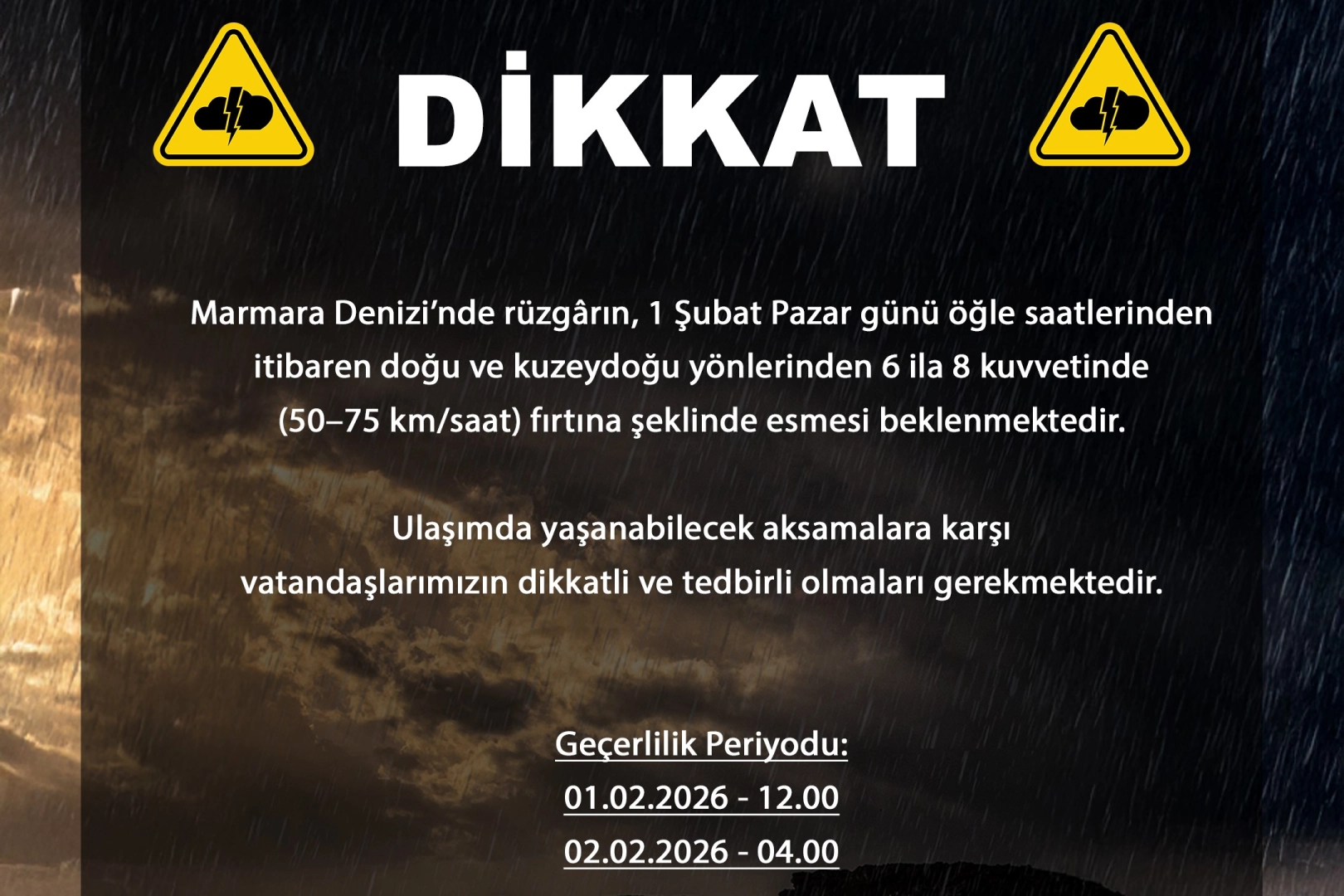 Yetkililer, beklenen fırtına nedeniyle deniz ulaşımında aksamalar yaşanabileceğini belirterek vatandaşların dikkatli ve tedbirli olmaları konusunda uyarıda bulundu. Fırtına uyarısının 1 Şubat 2026 saat 12.00’den başlayarak 2 Şubat 2026 saat 04.00’e kadar geçerli olacağı kaydedildi.