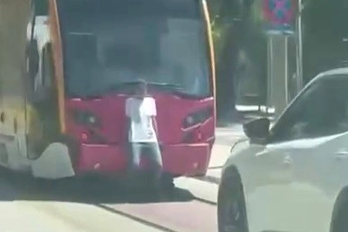 Bir genç, kendi canını tehlikeye atarak seyir halindeki tramvayın arkasına tutundu. Bir süre bu şekilde seyreden gencin tehlikeli anları, saniye saniye amatör kamera ile kaydedildi.