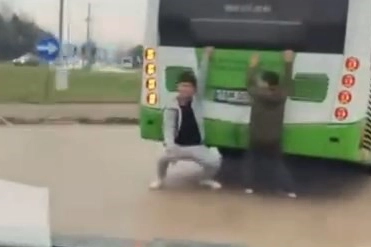 Canını hiçe sayan çocuklar, hem kendi hayatını hem de trafikteki diğer vatandaşların güvenliğini tehlikeye attı. Seyir halindeki otobüsün arka bölümüne tutunarak ayaklarını yere süre çocuklar, uzun süre bu şekilde yolculuk yaptı. Tehlikeli anlar, çevredeki bir vatandaşın cep telefonu kamerasına saniye saniye yansıdı.