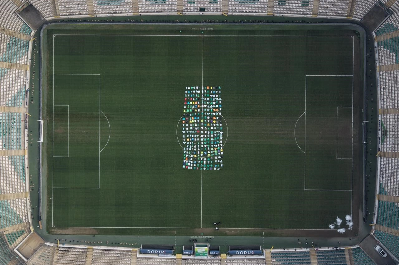 Bursa Atatürk Spor Kompleksi Matlı Stadyumu'nda zemine konulan yüzlerce imzalı forma gökyüzünden görüntülendi.