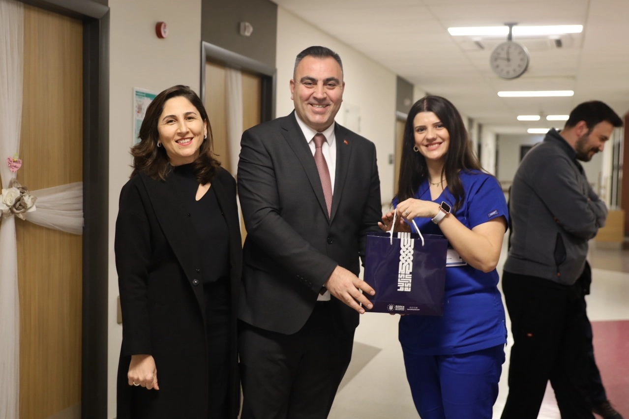 Büyükşehir Belediyesi Başkanvekili Mehmet Aydın Saldız, 2024'ün son ve 2025'in ilk ziyaretini Bursa Şehir Hastanesi’ne yaptı. Başkanvekili Saldız ve eşi İpek Saldız, beraberindeki Başhekim Yardımcısı Dr. Burcu Günsoy ile birlikte hastane personeline çiçek ve çeşitli hediyeler verdi. Başkanvekili Saldız, bebekleri 2024 yılının doğan son bebeği olarak kayıtlara geçen Gülcan ve Metin Çağlayan çiftini ziyaret etti. Çocuklarına Ezgi Ela ismini veren Çağlayan çiftine çiçek ve bebek seti hediye edilirken, Saldız minik bebeğe de altın taktı. Başkanvekili Saldız, daha sonra 2025’in ilk bebeğini de ziyaret etti. Elif ve Nevzat Ünlü çifti, Bilge ismini verdikleri bebeklerinin sevincini Başkanvekili Saldız ve beraberindekilerle birlikte yaşadı. Ünlü çiftine de çiçek ve bebek seti takdim edilirken, Başkanvekili Saldız minik bebeğe altın taktı.