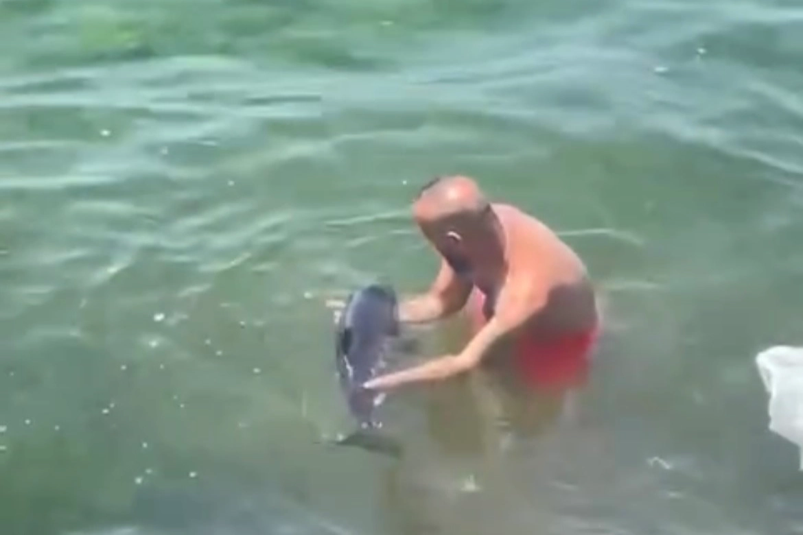 Çırpınan yunusu fark eden balıkçılardan biri hemen suya atlayıp, yunus balığını kurtarmak için seferber oldu.