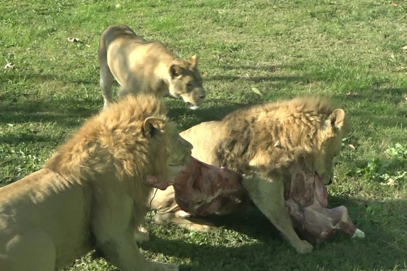 Bulundukları barınaklarından çıkan aslanlar, karkas olarak bırakılan yaklaşık 50 kiloluk eti kısa sürede parçaladı.