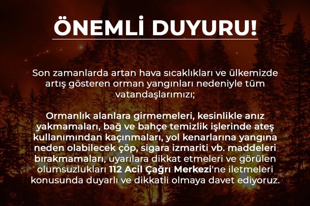 Bursa İtfaiyesi sosyal medya hesaplarından yaptığı açıklamada şu ifadelere yer verildi: "Son zamanlarda artan hava sıcaklıkları ve ülkemizde artış gösteren orman yangınları nedeniyle tüm vatandaşlarımızı; ormanlık alanlara girmemeleri, kesinlikle anız yakmamaları, bağ ve bahçe temizlik işlerinde ateş kullanımından kaçınmaları, yol kenarlarına yangına neden olabilecek çöp, sigara izmariti vb. maddeleri bırakmamaları, uyarılara dikkat etmeleri ve görülen olumsuzlukları 112 Acil Çağrı Merkezi’ne iletmeleri konusunda duyarlı ve dikkatli olmaya davet ediyoruz.