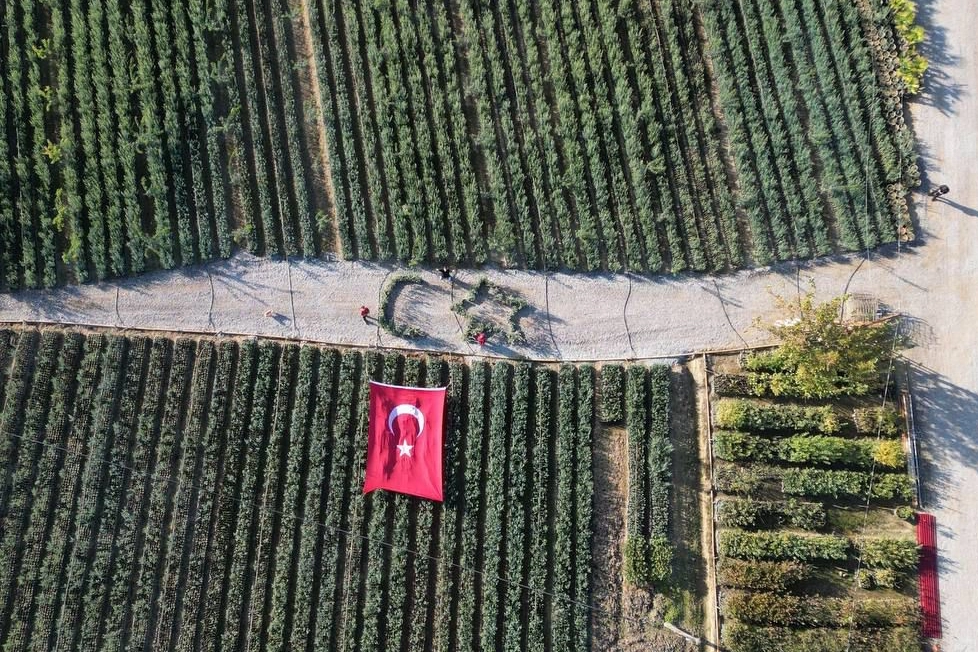 İşletmeci Sinan Demircan, zeytin bahçesine dev Türk Bayrağı açtı, zeytin fidanlarıyla Türk Bayrağı'nın simgesi ay ve yıldızı oluşturdu.