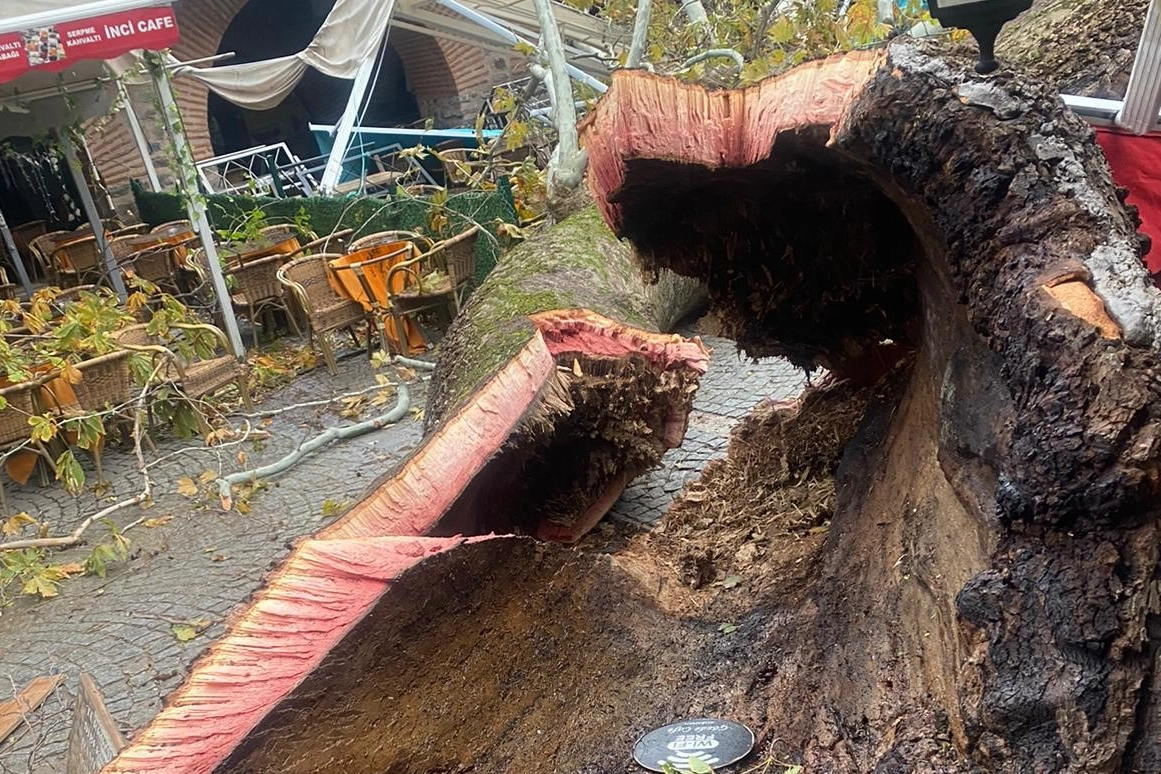 530 yıllık geçmişi bulunan tarihi handa, devasa çınar devrildiği esnada kimsenin bulunmaması muhtemel bir faciayı önledi.