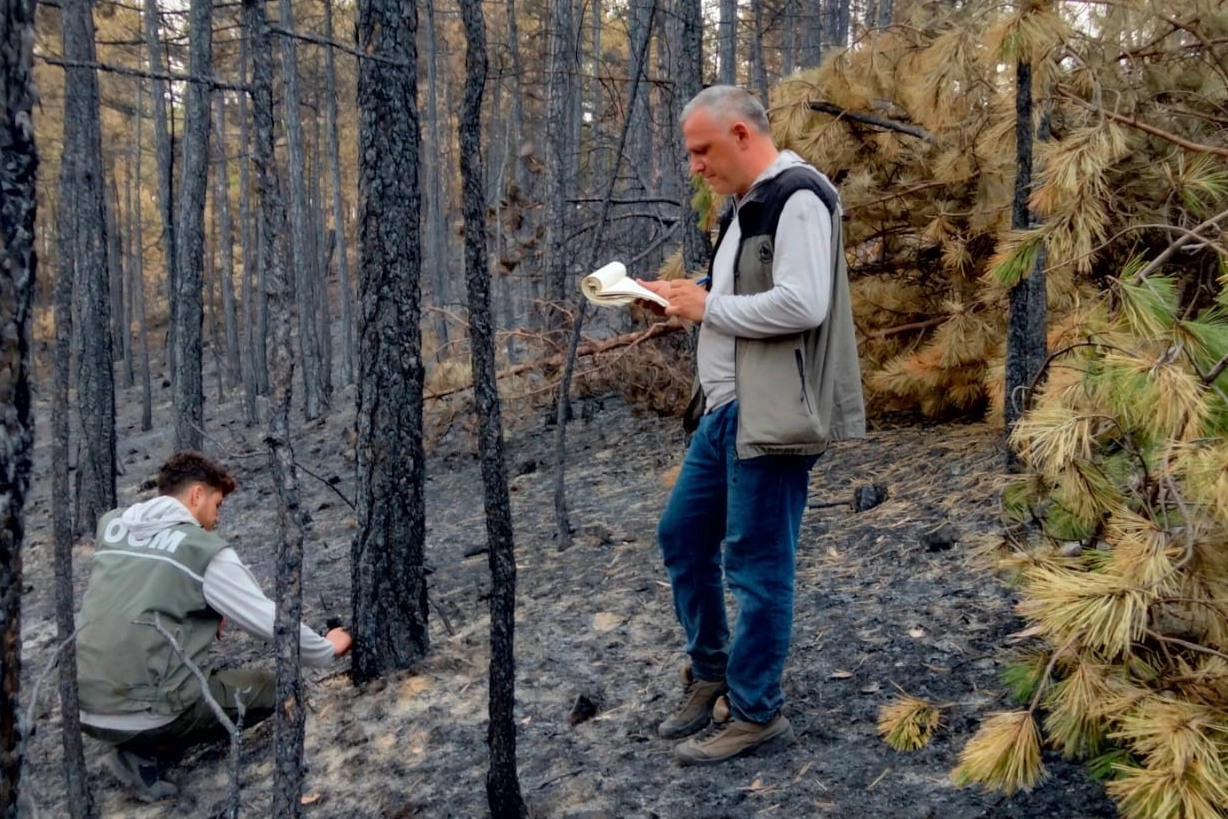 Yangının izlerini bir an önce silmek için temizlik çalışmalarının başladığını belirten yetkililer, yeniden ormanlaştırma çalışmalarının 2026 yılı sonuna kadar tamamlanması hedeflendiğini söyledi. Ekipler ellerinde metrelerle ağaçları karadan, dron ile de havadan tespit ettiler.