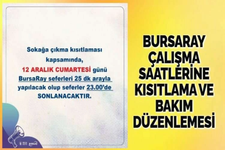 Burulaş’ın sosyal medya hesabından yapılan açıklamada, 'Sokağa çıkma kısıtlaması kapsamında, 12 Aralık Cumartesi günü BursaRay seferleri 25 dakika arayla yapılacak olup seferler saat 23.00’de sonlandırılacaktır' denildi. Ayrıca ikinci uyarıda ise , '13 Aralık Pazar günü Acemler - Üniversite İstasyonları arası BursaRay seferleri yapılacak çalışma nedeniyle HİZMET VEREMEYECEKTİR. Bu güzergahta OTOBÜS SEFERLERİ hizmet verecektir. Tüm değerli yolcularımıza duyurulur' ifadeleri kullanıldı.