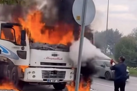 Bursa Çevre Otoyolu’nda seyir halindeki bir kamyonda yangın çıktı. Alevler kısa sürede tüm aracı sararken, o anlar cep telefonu kamerasına yansıdı. Olay, Bursa Çevre Otoyolu’nda meydana geldi. İddiaya göre, trafikte ilerleyen bir kamyonun motor kısmından henüz bilinmeyen bir nedenle dumanlar yükselmeye başladı. Kısa sürede alevlere dönüşen yangın, tüm aracı sardı. Durumu fark eden sürücü, kamyonu emniyet şeridine çekerek kendini dışarı attı. İhbar üzerine olay yerine çok sayıda itfaiye ve polis ekibi sevk edildi. İtfaiye ekipleri yangına kısa sürede müdahale ederek alevleri kontrol altına aldı. Yangın sırasında çevrede yoğun duman oluşurken, bölgedeki trafik bir süre aksadı. Yangının çıkış nedeni henüz belirlenemezken, olayla ilgili inceleme başlatıldı.