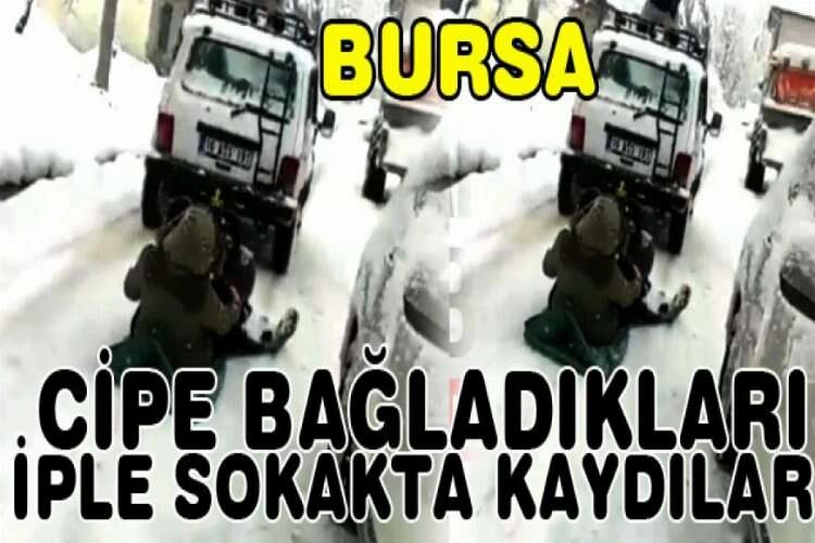Bursa'nın İnegöl ilçesine bağlı kırsal Eskikaracakaya Mahallesinde aracın arkasına bağladıkları iple 3 kişinin kar üzerinde kaydığı ânlar kameraya yansıdı.