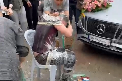 Mahalle arkadaşları önce düğün konvoyunun önünü kesip damattan hediyeleri aldılar, ardından meydanda sandalyeye bağladılar. Arkadaşları, damadın başında yumurta kırıp, un, süt, ketçap ve mayonez döktü. Dakikalarca süren eğlence sonunda damat Sevinç, son olarak arkadaşları tarafından su dökülerek yıkandı. Görülmemiş eziyetin ardından damat düğüne uğurlandı.