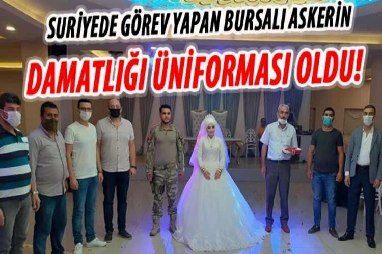 Esra Aydın (25) ile evlenen Uzman Çavuş Ali Arslan (27), düğününde damatlık yerine üniformasını giydi. Ali Arslan ve Esra Aydın evlenme kararı aldı. Suriye'de görev yapan Ali Arslan, düğün tarihi yaklaşınca memleketi Bursa'ya geldi. Çift, dün akşam İnegöl'de en mutlu günlerini yaşarken, damat Ali Arslan'ı görenler şaşkınlık yaşadı. Gelinlik giyen eşi ile el ele tutuşarak düğün salonuna giren Uzman Çavuş Ali Arslan, damatlık yerine askerî üniformasını giydiğini ve çok mutlu olduğunu söyledi.