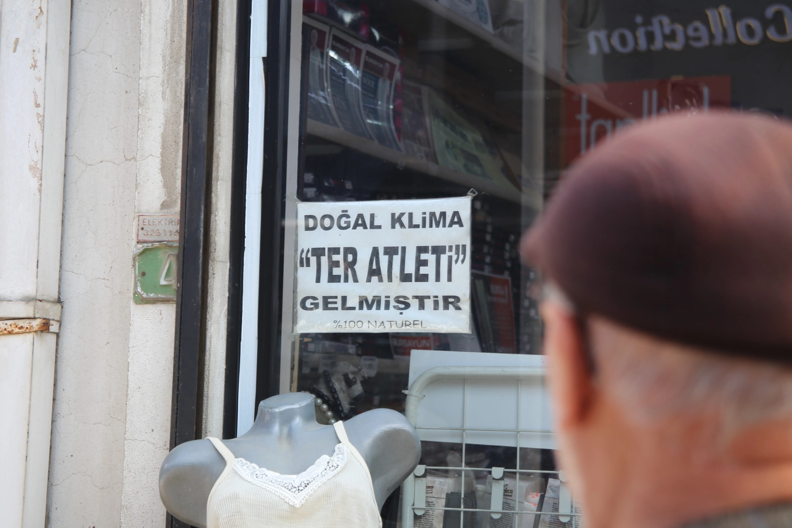 Meteoroloji Genel Müdürlüğü verilerine göre, yurt genelinde hava sıcaklıklarının hafta içinde yükseleceğini duyurması üzerine sıcaktan bunalmak istemeyen vatandaşlar çözüm yolu arıyor. Bursa'da yıllardır yün iç çamaşırı satışı yapan esnaf Naci Bağcı ise baharın gelmesini fırsat bilerek dükkanının camına bir afiş astı. Daha öncesinde 'Doğalgazı düşüren donlar burada' afişi ile görenleri şaşırtan Bağcı, bu sefer de 'Doğal klima ter atleti gelmiştir' yazarak görenleri gülümsetti. Malzemenin doğal klima görevi gördüğünü ve yazın serinletici etki sağladığını ifade eden esnaf Naci Bağcı, "Müşterilerimiz, bilmeyenlere bu özelliği anlatıyor. Yeni gelen müşteriler ise bu tavsiyelere güveniyor ve memnun kaldıklarında başkalarına da öneriyorlar. Çok terleyen müşterilerimiz geliyor çünkü bu ürün, doğal klimalı ter atleti. Bunun başka bir ilacı ya da devası yok. Ayrıca koku yapmıyor ve teri hızlı bir şekilde kurutuyor. Doğalgazı düşüren donlar burada afişlerinden sonra büyük ilgi buda çok büyük bir ilgi gördü. İnsanlar gelip afişlerin önünde fotoğraf çektiriyor. Böyle şeylerle karşılaşmak bizi çok mutlu ediyor" dedi.