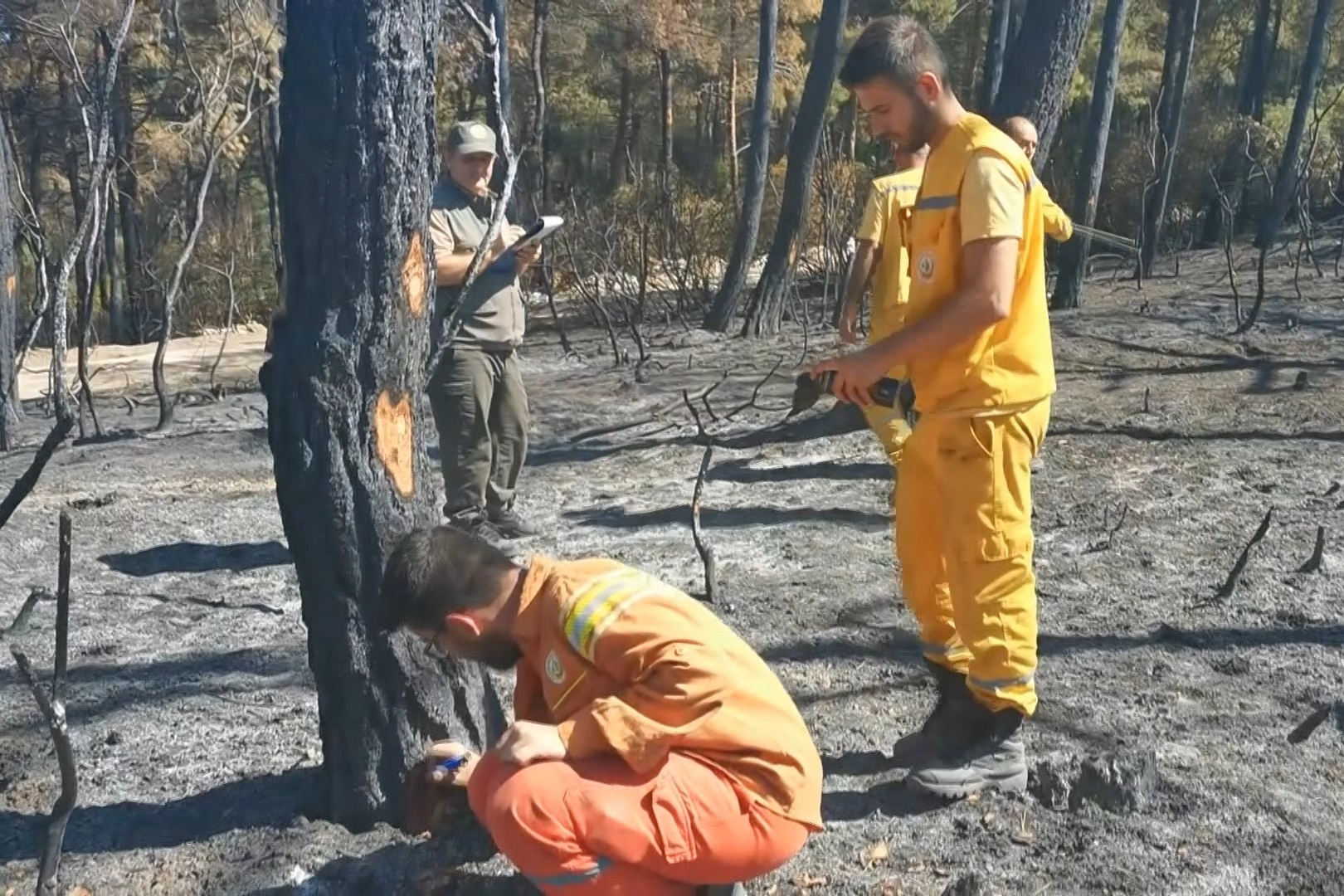 Havadan dron ile yapılan çalışmaların yanı sıra, karadan ise orman ekiplerinin hummalı çalışmaları sürüyor. Ekipler, ağaçların gövdelerine bakarak yaşama ihtimali veya kesilme durumunu netleştiriyor.