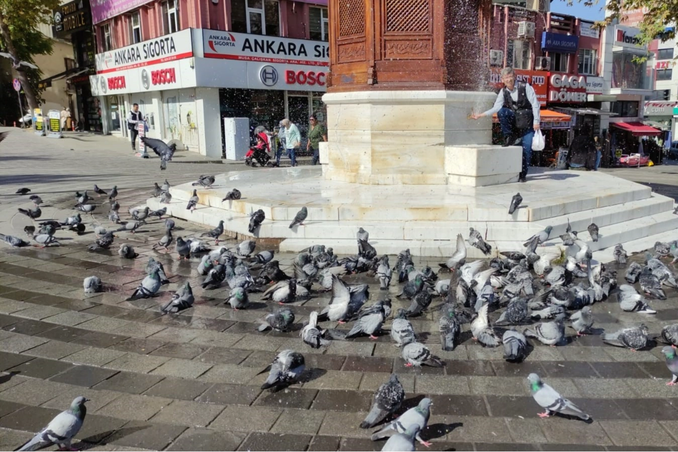 Bursa’nın en işlek meydanlarından 15 Temmuz Demokrasi Meydanı’nda bulunan güvercinlerin mevsim normalleri üzerinde seyreden havada sıcaktan bunaldığını gören bir vatandaş meydanda bulunan çeşmenin suyunu açarak güvercinlere doğru tutmaya başladı.