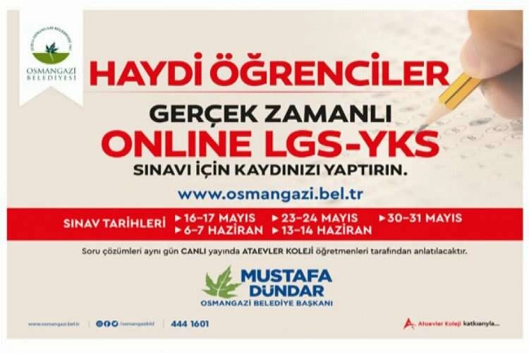 Osmangazi Belediyesi, korona virüs salgını sebebiyle okulları kapanan ve uzaktan eğitim ile Yükseköğretim Kurumları Sınavı (YKS) ve Liseye Geçiş Sınavı’na (LGS) hazırlanan öğrencilere online sınav düzenleyerek destek olacak. Sınavlara girmek isteyen öğrenciler, www.osmangazi.bel.tr adresinde yer alan formu doldurarak kayıt yaptırabilecek. .