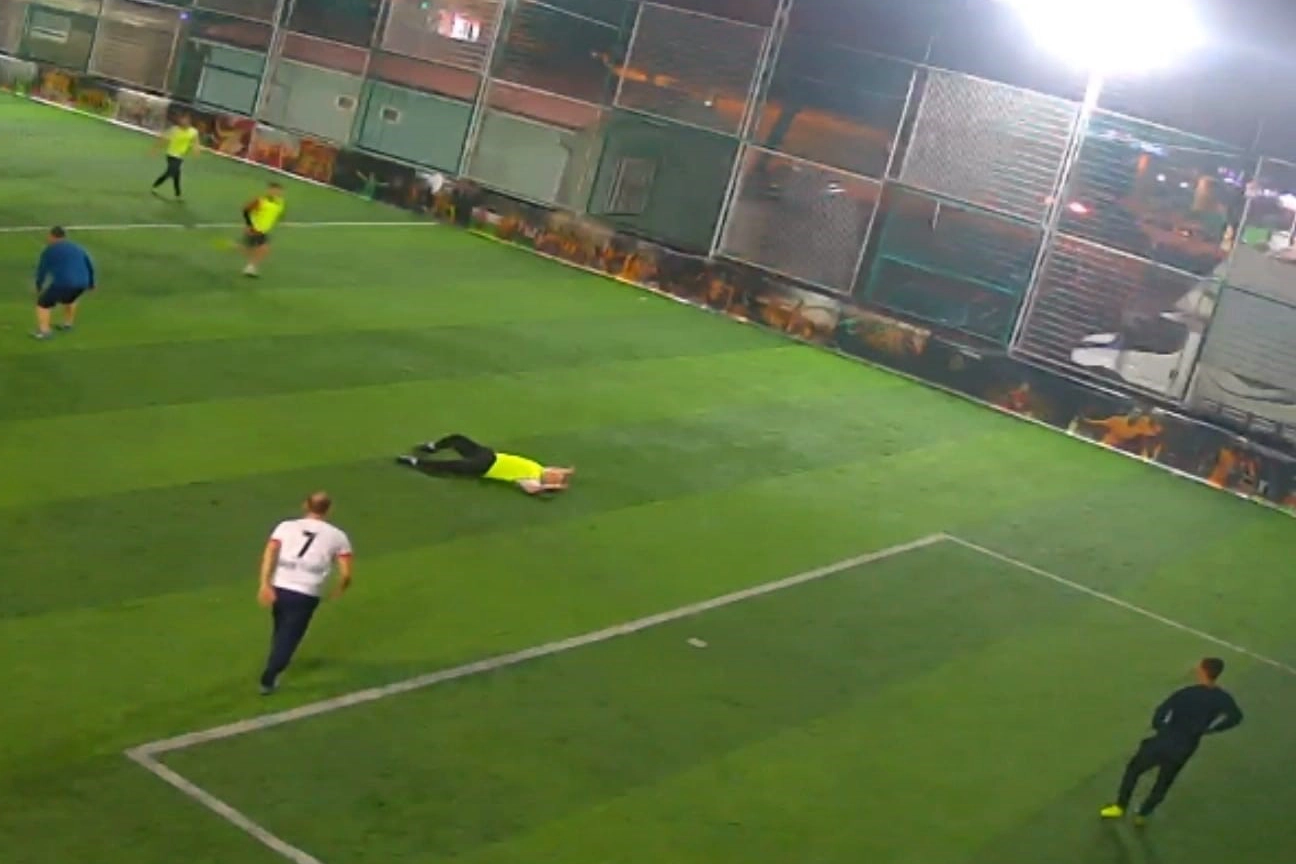 Gencin maç esnasında yere düştüğü ve arkadaşları ile 112 ekiplerinin müdahaleleri işletmenin güvenlik kamerasına saniye saniye yansıdı.