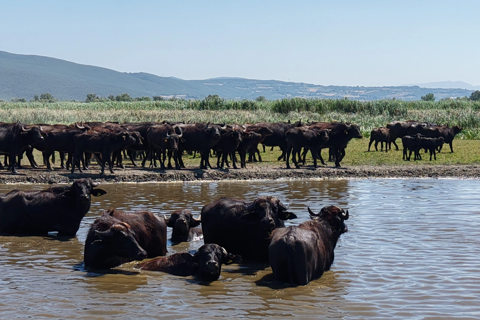 Bursa'nın Mustafakemalpaşa ilçesinin Uluabat Gölü'ne kıyısı bulunan kırsal Karaoğlan Mahallesi'nde mandalar yılın her döneminde suya girerek hem serinliyor, hem parazitlerinden arınıyor, hem de süt verimi artıyor.