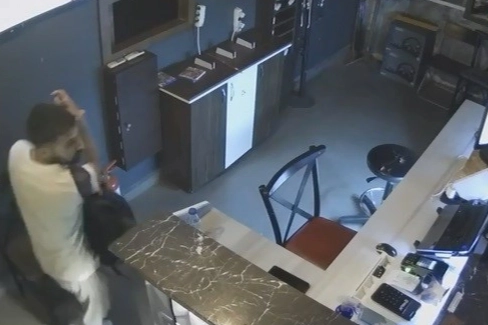 Oyun salonuna giren hırsız önce etrafta kolaçan ettikten sonra, tezgahın arkasına geçti.