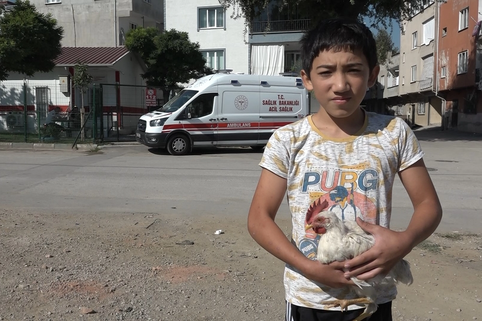 Dışarı çıkan sağlık çalışanları, karşı kapı komşuları Uğurcan Felamur’un elinde yaralı tavuğu görünce gözlerine inanamadı. Çitlerden atlarken ayağını tellere taktırarak yaralanan tavuk, sahibinin elinden alınarak ambulansta müdahale edildi.