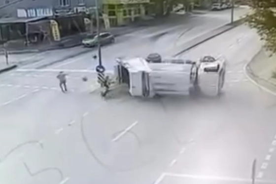 Çarpmanın etkisiyle takla atan kamyon ters dönerken, ortalık savaş alanına döndü. Kaldırımda bekleyen bir vatandaş ise kazayı kıl payı atlattı. Kazayı gören vatandaşlar sürücünün yardımına koşarken, o anlar güvenlik kamerasına saniye saniye yansıdı.
