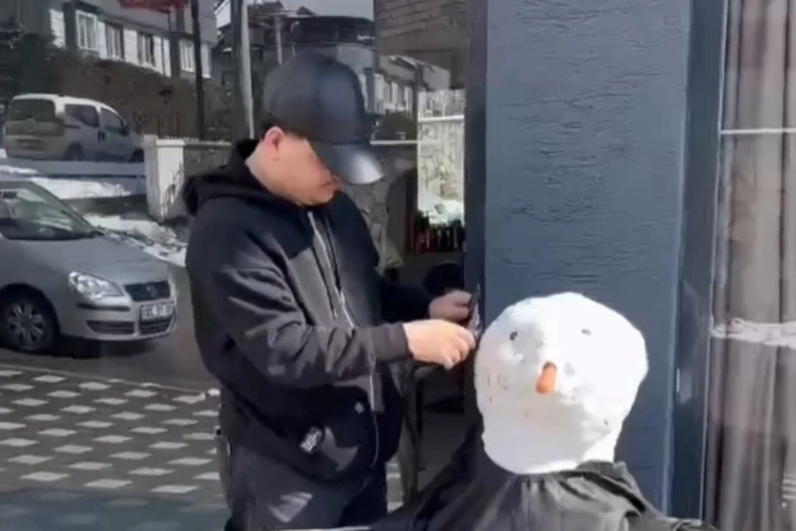 Kar yağışıyla birlikte fazla tıraşa gelmeyen olunca, berber ise çareyi kardan adamı tıraş etmekte buldu. Dükkanının önüne yaptığı kardan adama önlük giydiren esnaf, hem saç hem sakal tıraşı yapmayı ihmal etmedi. Farklı farklı kar yağışına sevinen vatandaşların yaşadığı komik anlar, kameralara ise saniye saniye yansıdı.