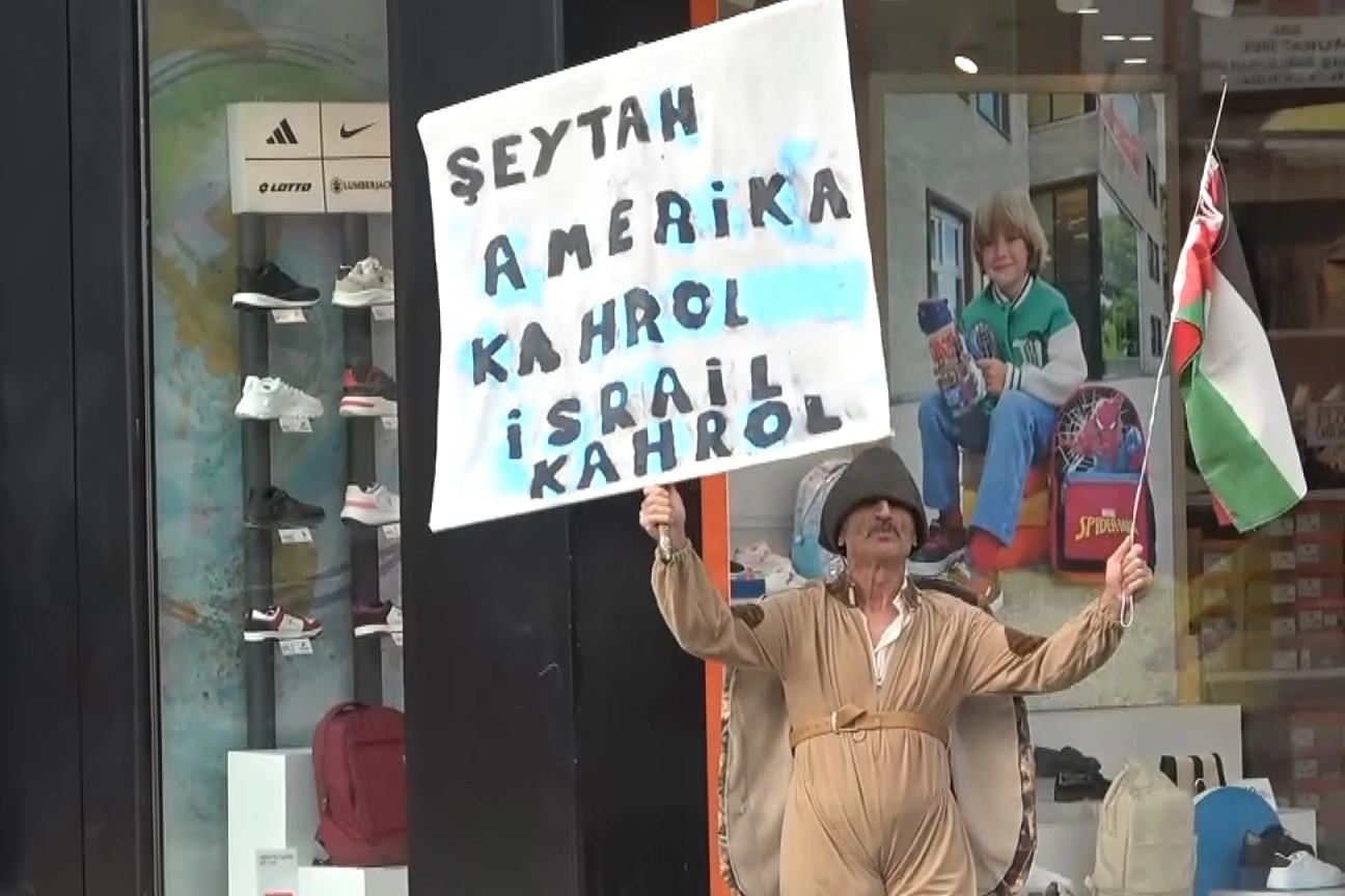 Amerika ve İsrail'in işlediği insanlık suçuna sessiz kalamadığını aktaran tiyatro sanatçısı Bahtiyar Keskin, “Bu eylemi 1 aydır farklı hayvan kostümleri giyerek gerçekleştiriyorum. Eylemi gerçekleştirme maksadım tüm halkı İsrail'in Filistin'de yaptığı zulüm hakkında bilinçlendirmek. İsrail'in Amerika'yı karakol olarak kullanıp bizlere suçlu değiliz gibisinden Amerika, şeytanca bir oyun oynuyor. İsrail'e gizlice gemi ve uçak gönderip halkı ateşkes yapmak istiyoruz diye kandırıyor. Netanyahu, Amerika'dan güç aldığı için sürekli kadın ve çocukları öldürüyor. Netanyahu, sıkıyorsa Hamas'ın askerlerine saldırın. Amerika, senin gücü sadece çocuklara ve kadınlara mı yetiyor, bu mu Amerika'nın gücü. Amerika'nın büyük bir İslam düşmanlığı var. İslam düşmanlığı olmasaydı, Müslümanlara bu şekilde zulüm uygulamazsın. Bu kadar Filistinliye zulüm yapılıyor. Filistinlileri çadırlarda toplayıp toplu vuruyorsun. Nemrut o kadar güçlü olmasına rağmen burnuna sinek girdi. Ondan sonra Nemrut kafasını duvara vura vura öldü. Ben de burada arı adam olarak Amerika'nın burnundan sokup zehirleyeceğim” diye konuştu.