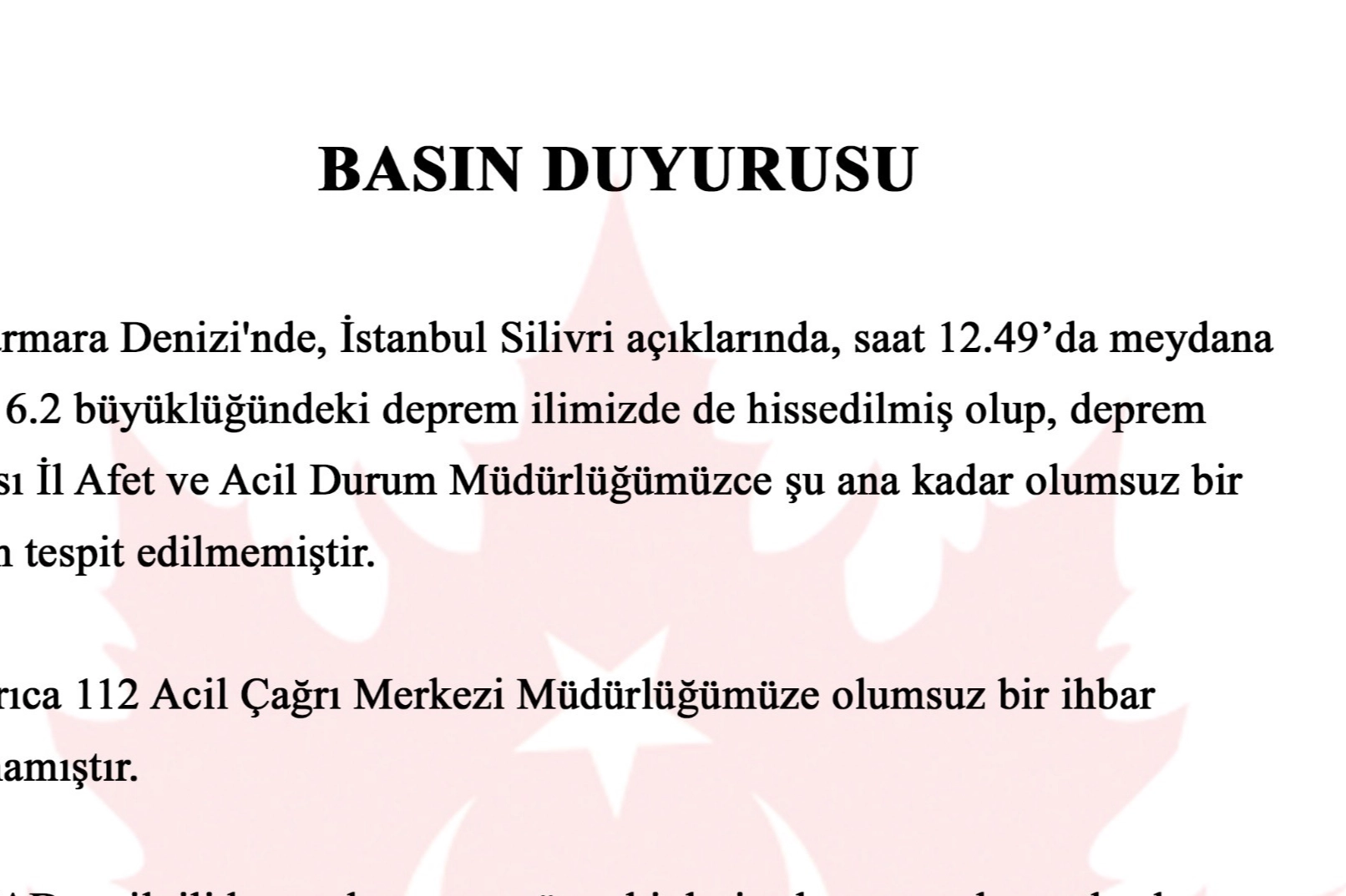 Deprem sonrası vatandaşlar panik dolu anlar yaşarken, Bursa Valiliği deprem ile ilgili açıklama yaptı. Bursa Valiliği'nden yapılan açıklamada, "Marmara Denizi'nde, İstanbul Silivri açıklarında, saat 12.49’da meydana gelen 6.2 büyüklüğündeki deprem ilimizde de hissedilmiş olup, deprem sonrası İl Afet ve Acil Durum Müdürlüğümüzce şu ana kadar olumsuz bir durum tespit edilmemiştir.