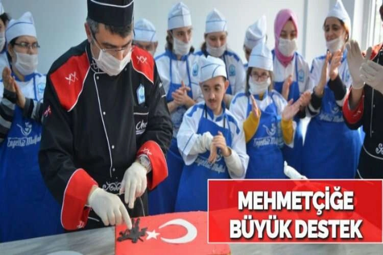 Keyifli anların yaşandığı ziyarette, ‘Engelsiz Mutfak’ öğrencileriyle birlikte kolları sıvayan Yıldırım Belediye Başkanı Oktay Yılmaz, usta önlüğünü giyerek üzerinde Mehmetçik figürü bulunan ay-yıldızlı pasta hazırladı. Engelsiz Mutfak öğrencilerinin meraklı bakışları arasında pasta yapmada hünerlerini sergileyen Başkan Yılmaz, öğrencilerden tam not aldı. Daha sonra Engelsiz Yaşam Okulu’ndaki sınıfları tek tek gezerek öğrencilerle bir araya gelen Başkan Yılmaz, Müzik Akademisi kursiyerlerinin seslendirdiği Fikret Şeneş’in unutulmaz eseri ‘Memleketim’ şarkısına eşlik etti. Kahraman Türk ordusuna ve askerlerimize destek olmak adına engel tanımayan öğrencilerle birlikte bir çalışma gerçekleştirdiklerini dile getiren Yıldırım Belediye Başkanı Oktay Yılmaz, “Ülke olarak art arda yaşadığımız elim olaylar nedeniyle Engelsiz Yaşam Okulumuzda ‘Engelsiz Mutfak’ öğrencilerimizle bir araya gelerek bir farkındalık çalışması gerçekleştirmek istedik. Bu kapsamda kursiyerlerimizle birlikte askerlerimiz için bir yaş pasta hazırladık. Bununla beraber öğrencilerimizle kahramanlarımız için hem şarkılar söyledik hem de bu şekilde 7’den 70’e bütün Türkiye’nin destek olduğu gibi engel tanımayan kardeşlerimizin desteği ve duasını da kahraman ordumuza ilettik. Öte yandan ‘Engelsiz Mutfak’ öğrencilerimizle yaptığımız bu yaş pastayı Yıldırım Jandarma Karakolumuzda görev yapan Mehmetçiklerimize ikram edeceğiz” diye konuştu.