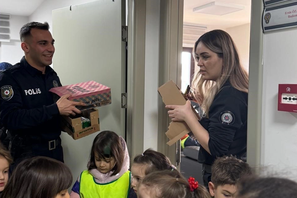 Bursa'nın Yıldırım ilçesinde anaokuluna giden 3-6 yaş gurubu öğrenciler, öğretmenleriyle birlikte polis merkezine gidip polis ekiplerini ziyaret etti.