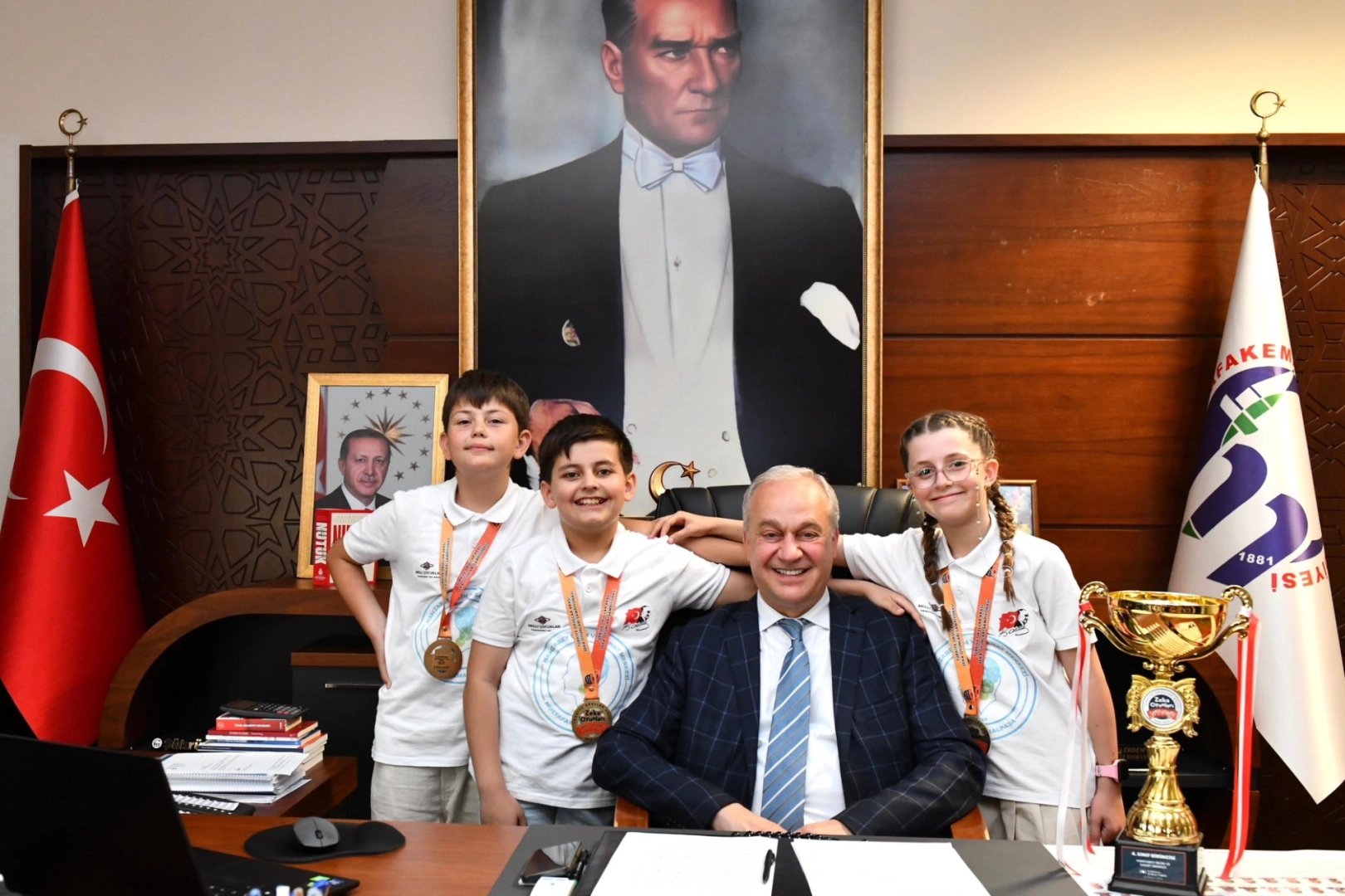 Başkanlık makamında gerçekleşen buluşmada Başkan Erdem, şampiyon öğrenciler Efe Berk Yağlıoğlu, Beren Yenici ve Yağız Şen ile tek tek ilgilenerek, başarılarının kendilerini son derece gururlandırdığını ifade etti. Öğrencilerin başarısında emeği geçen öğretmenleri de unutmayarak teşekkürlerini ileten Erdem, “Bu tür başarılar, eğitimde ve bilimsel düşüncede atılan adımların ne denli önemli olduğunu bir kez daha gösteriyor. Gençlerimizin bu azmi, bizlere geleceğe dair umut veriyor,” dedi.