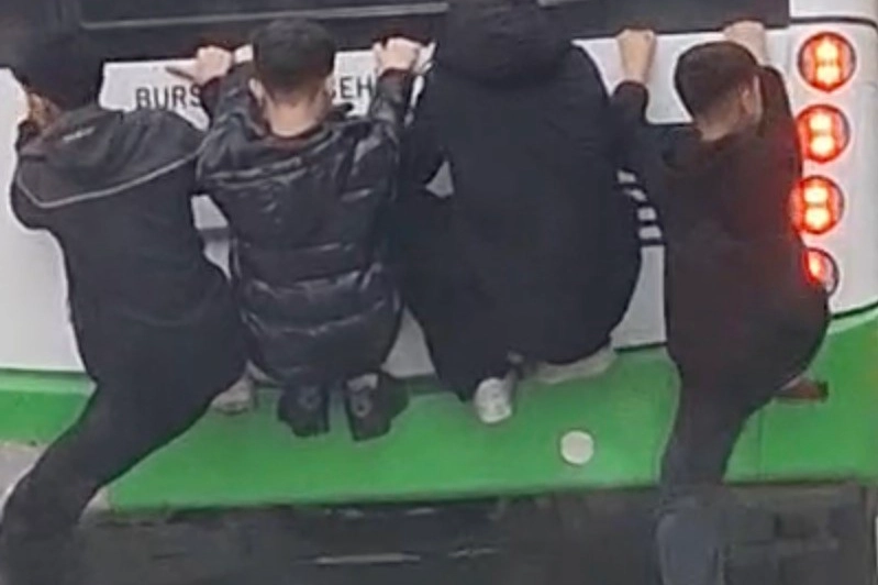 Bursa’nın Yıldırım ilçesinde seyir halindeki özel halk otobüsünün arkasına tutunan 4 lise öğrencisi, hem kendi canlarını hem de trafikteki diğer sürücüleri tehlikeye attı.