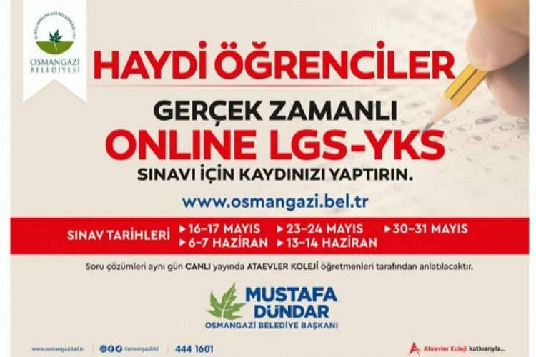 Osmangazi Belediyesi, koronavirüs salgını sebebiyle okulları kapanan ve uzaktan eğitim ile Yükseköğretim Kurumları Sınavı (YKS) ve Liseye Geçiş Sınavı’na (LGS) hazırlanan öğrencilere online sınav desteği veriyor. 20 Haziran’da yapılacak LGS ve 27-28 Haziran’daki YKS için son hazırlıkları yapan öğrenciler, Osmangazi Belediyesi’nin düzenlediği online sınavda bilgilerini sınama imkanı buluyor. Osmangazi Belediyesi ve Ataevler Koleji işbirliğinde 16-17 Mayıs tarihlerinde başlayan online sınavların beşincisi bu hafta sonu gerçekleştirilecek. Sınavlara girmek isteyen öğrenciler, www.osmangazi.bel.tr adresinde yer alan formu doldurarak kayıt yaptırabilecek. Öğrenciler, 13 Haziran Cumartesi günü LGS deneme, 14 Haziran Pazar günü ise Temel Yeterlilik Testi (TYT) sınavında bilgilerini test edebilecek. Sınav günü öğrenciler, soruların cevap anahtarına ve çözümüne ulaşabilecek. Soruların çözümü Ataevler Koleji öğretmenleri tarafından öğrencilere anlatılacak. Osmangazi Belediye Başkanı Mustafa Dündar, düzenlemiş oldukları online sınavların, gerçek sınavlar öncesi öğrencilerin bilgilerini sınamak adına büyük önem taşıdığını belirterek sınava girecek tüm öğrencilere başarılar diledi. Online sınavlara bugüne kadar 22 bin civarında öğrencinin katılım sağladığını belirten Dündar, “Öğrencilerimiz için düzenlediğimiz deneme sınavlarının başarılarına katkı sağlamasını diliyorum. Zorlu sınav öncesinde öğrencilerimize destek vermek istedik. Artık, sınavlara az bir zaman kaldı. Bütün öğrencilerimize başarılar diliyorum” dedi.